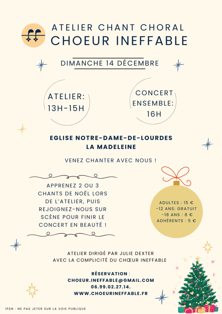 Venez répéter deux ou trois chants de Noël avec le Chœur Ineffable de 13h à 15h, que nous aurons la chance d’interpréter sur scène avec vous pour clore notre concert qui aura lieu à 16h le jour même.